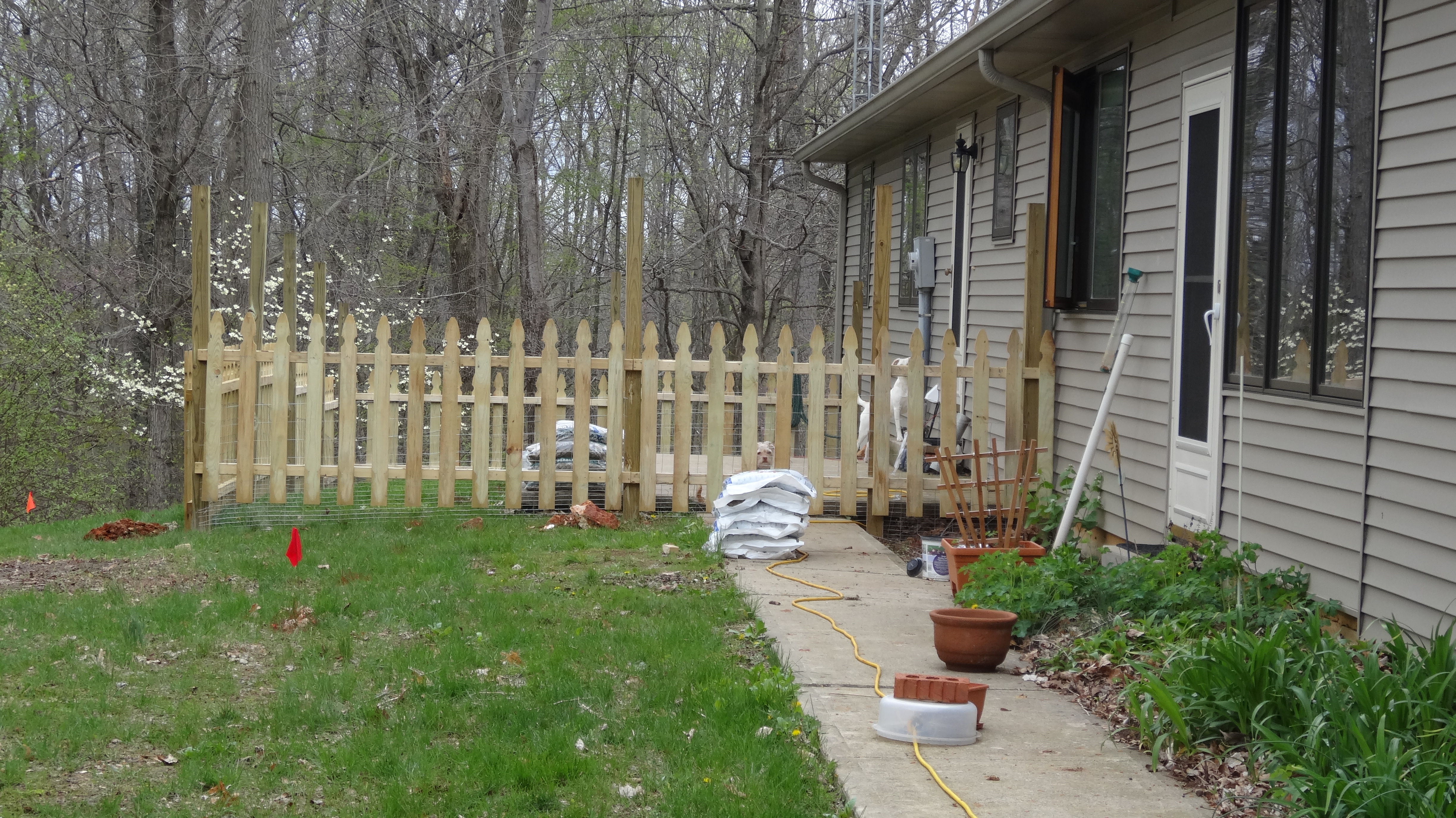Fence going up at back patio.Fencing is going up around the back patio for the safety of two groups of animals.  I have many stray dogs on my property and they are not all friendly to my dogs.  I’m also brooding chicks and they will be free ranged.  Since I’m not sure how my dogs will behave with them, the fence works two-fold.  (One dog is a little terrier that gets too excited and the other is a Labrador puppy mix that doesn’t know her own strength yet.)  The fence is lined on the inside with rabbit fencing.